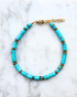 Deze vrolijke blauwe Turkoois armband brengt kleur en betekenis samen in één prachtig sieraad. Turkoois staat bekend om haar beschermende werking tegen negatieve energie en helpt je om open en duidelijk te communiceren. De combinatie van blauwe turkoois met goudkleurige details maakt deze armband een echte eyecatcher. Perfect om solo te dragen of te mixen met andere armbanden voor een speelse look.